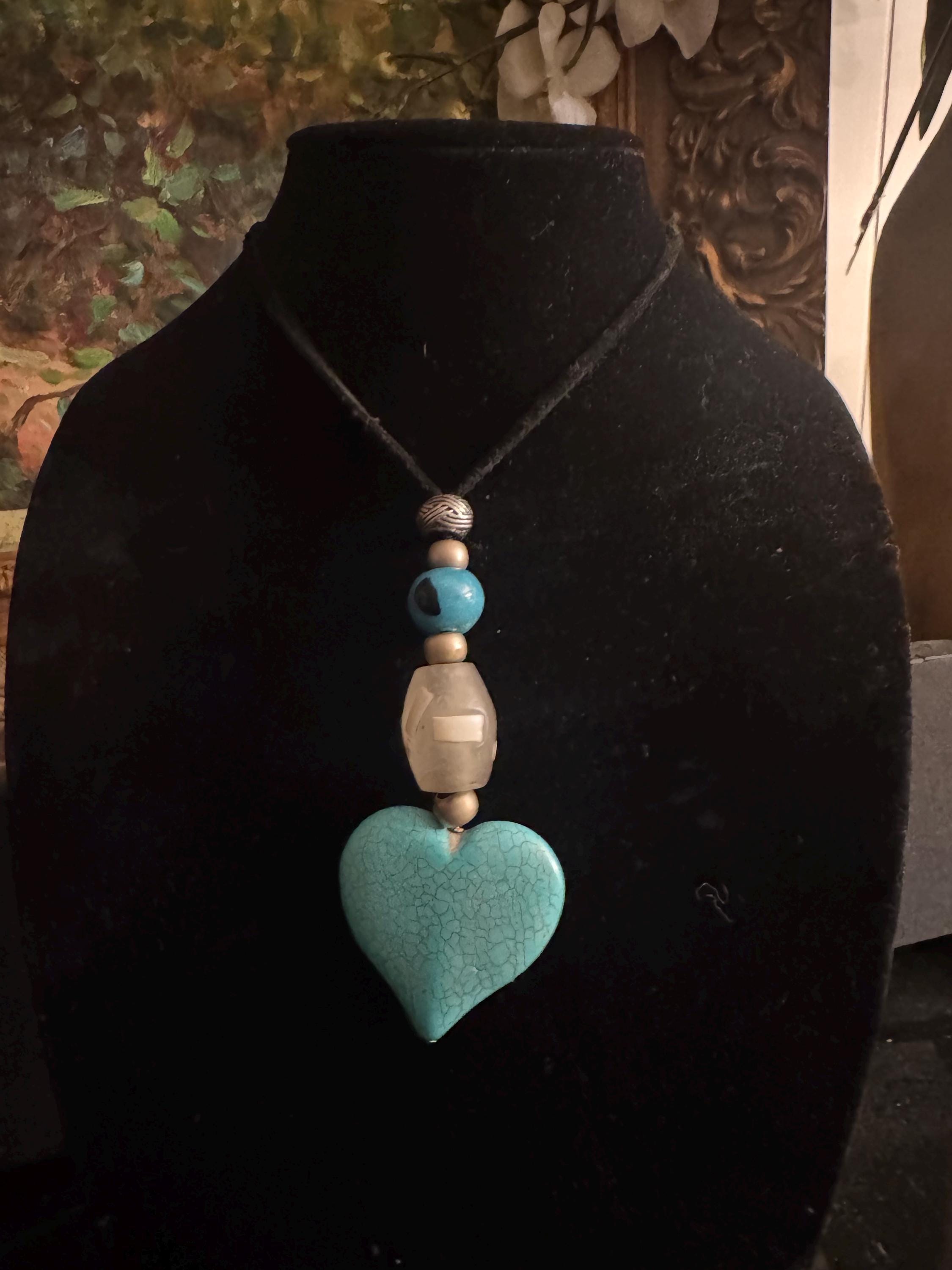 One of a kind….. Ceramic Heart painted Faux Turquoise with Glass beads on genuine leather.